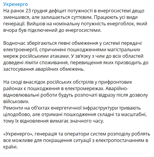 По состоянию на утро 23 декабря дефицит мощностей в энергосистеме Украины несколько уменьшился, но все равно остается существенным. До всех областей доведены лимиты потребления.