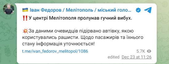 В пятницу, 23 декабря, в центре Мелитополя прозвучал мощный взрыв, там взорвался автомобиль.