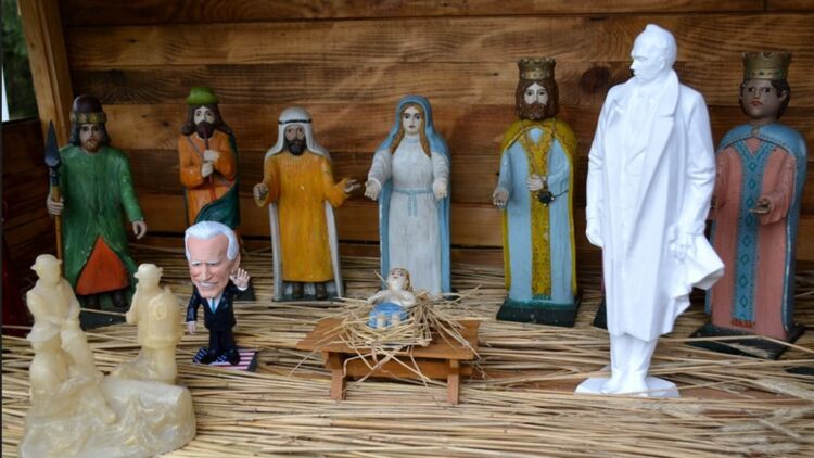 В Государственном историко-культурном заповеднике "Нагуевичи", что во Львовской области, возле литературного музея установили рождественскую шопку (вертеп). Среди традиционных библейских персонажей там можно увидеть фигуры трех гуцулов, президента США Джо Байдена и лидера ОУН Степана Бандеры.