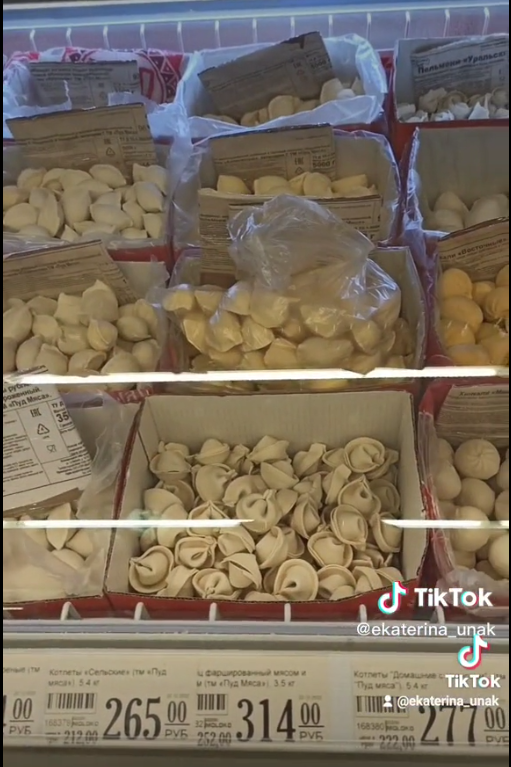 Судя по роликам из местных супермаркетов, пачка риса или гречки там стоит 100-150 рублей (50-70 гривен при курсе 2 к 1), упаковка творога - 166 рублей (80 гривен), йогурт - 67 рублей (30 гривен), пельмени - 260-315 рублей за килограмм (130-160 гривен).