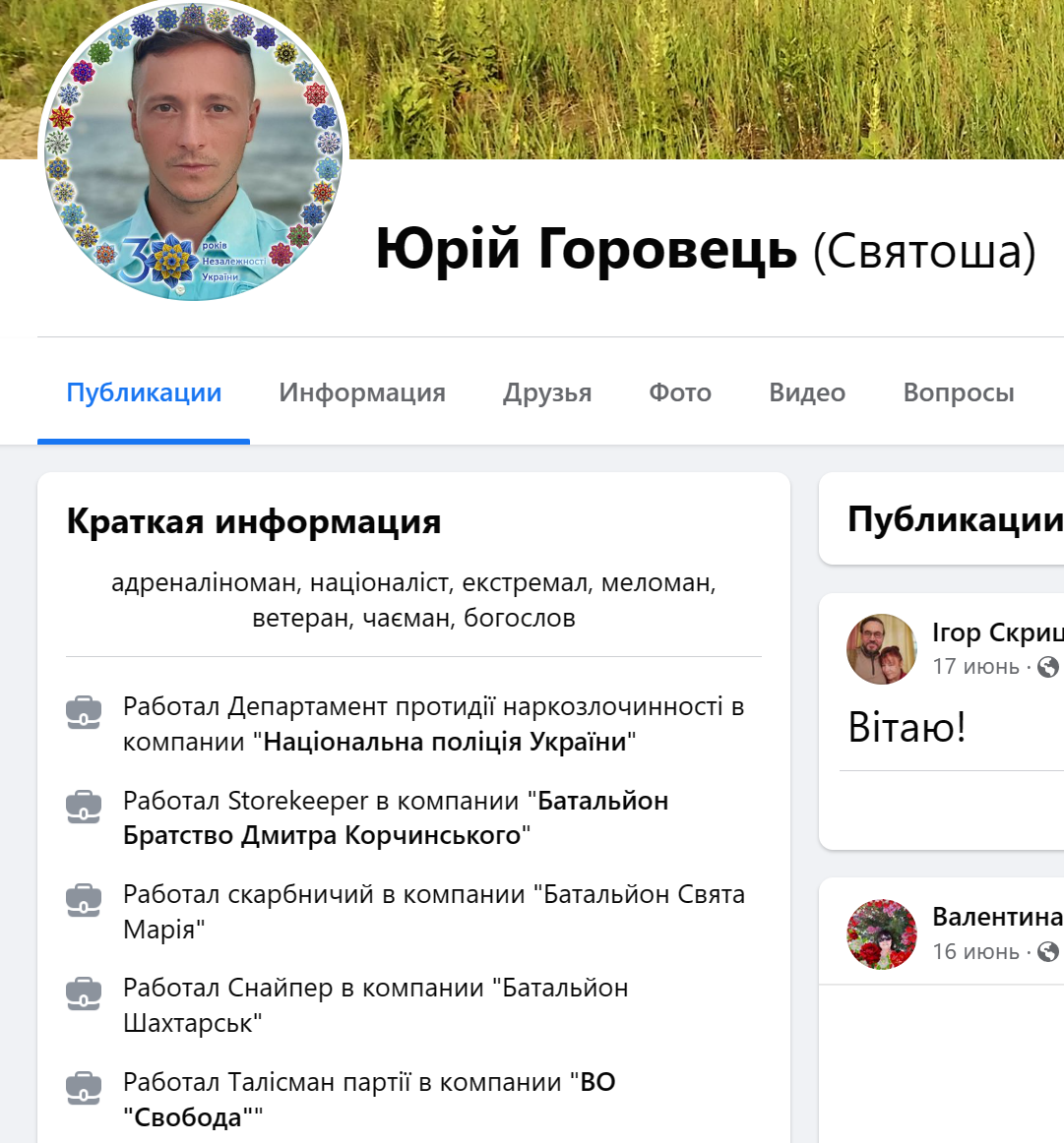 Юрий Горовец, судя по его странице в соцсетях, также связан с "Братством". В своём профиле он указал, что работал в этой организации, а также служил в созданном Дмитрием Корчинским батальоне "Святая Мария".