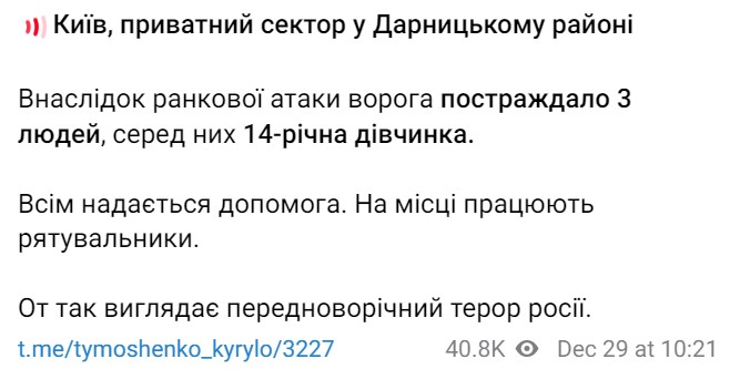 В результате утренней атаки россиян на Киев 29 декабря пострадали три человека, среди них 14-летняя девочка.