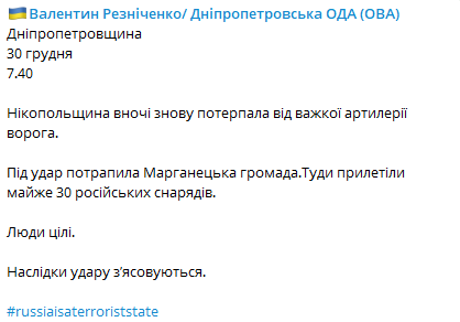 Сегодня ночью, 30 декабря, Никопольский район Днепропетровской области снова пострадал от тяжелой артиллерии врага. Под удар также попала Марганецкая община, куда прилетели почти 30 российских снарядов.