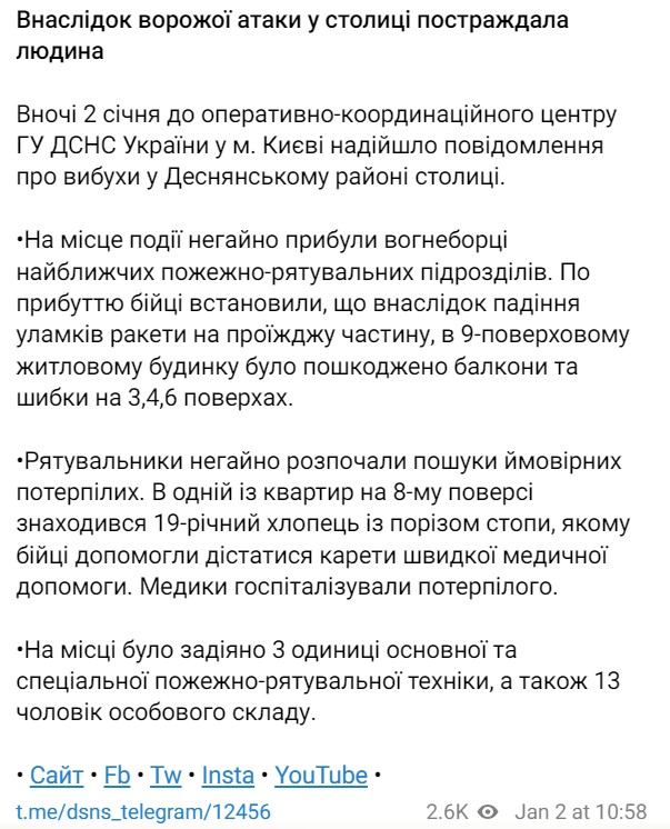 Спасатели получили сообщение о взрывах в Деснянском районе столицы, и по прибытию обнаружили, что из-за падения ракеты на проезжую часть в 9-этажном доме повреждены балконы и окна на 3, 4 и 6 этажах.