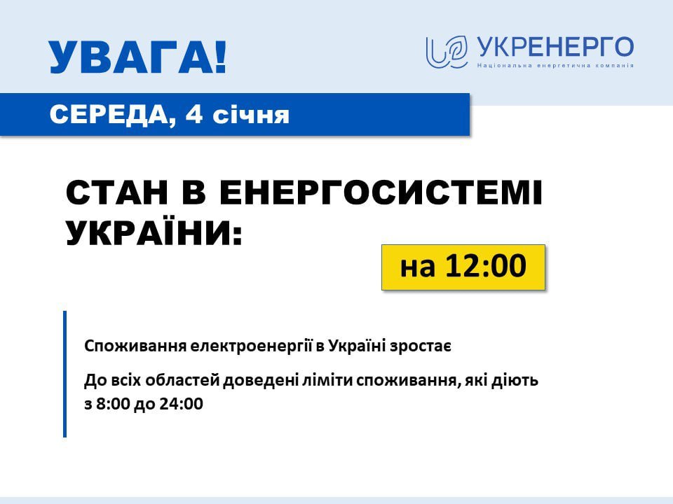 13.04 В Украине растет потребление электричества, в связи с этим во всех областях введены лимиты потребления, которые действуют с 8 утра до полуночи, сообщили в Укрэнерго.