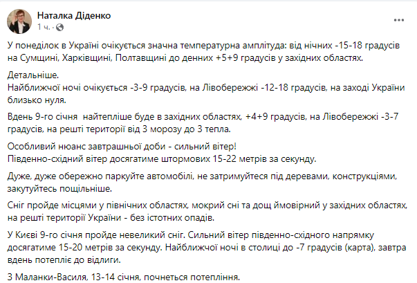 Также синоптик сообщила, что с 13-14 января на территории Украины начнется потепление.