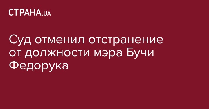 Апелляционный суд Киева в четверг отменил определение Печерского райсуда столицы об отстранении городского головы г.Буча (Киевская обл.) Анатолия Федорука от занимаемой должности. "Суд отменил определение райсуда об отстранении от должности, указав, что подозрение не обосновано надлежащим образом", - сообщила в четверг агентству "Интерфакс-Украина" юрист из команды защиты Федорука Валентина Теличенко.