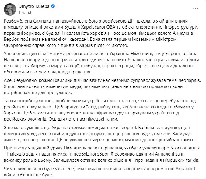 "Каждую минуту во время визита нас незримо сопровождала тема Леопардов... Я думаю, что и немецкое правительство где-то в глубине души уже понимает, что это решение будет принято", - заявил Кулеба.