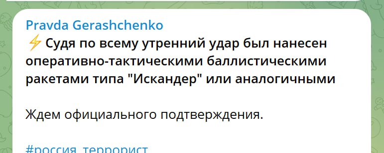 10:07 Советник главы МВД Антон Геращенко предположил, что утренний обстрел Киева велся из комплекса "Искандер".