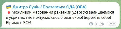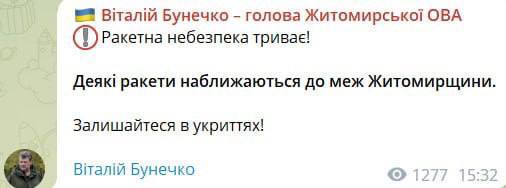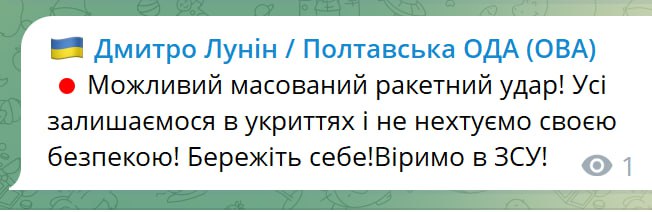 10:39 Черкасский губернатор предупреждает о возможности массированной ракетной атаки по Украине. Ориентировочно - с 12 часов дня.