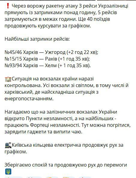 21:33 Из-за обстрелов несколько поездов "Укрзализныци" задерживаются. Почти на три часа опаздывают составы "Харьков-Ужгород" и "Краматорск-Киев".