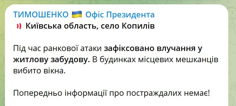 А Офис президента сообщает о прилете в село Копылов Киевской области. Есть попадание в жилую застройку. Предварительно - без пострадавших.