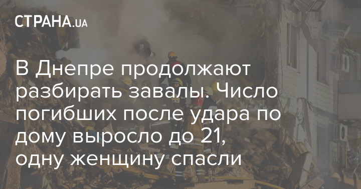 В Днепре продолжают разбирать завалы. Число погибших после удара по дому выросло до 21, одну женщину спасли