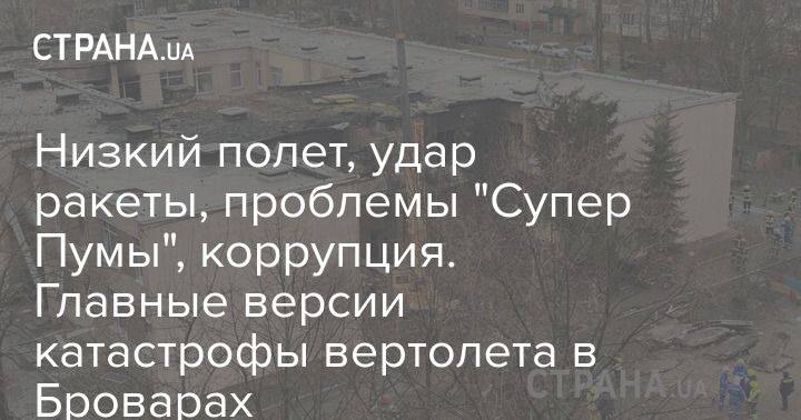 Первая - вертолет летел на низкой высоте (этот факт подтверждает начальник полиции Киевской области Андрей Небытов) и мог задеть некий объект. Эксперты говорят, что украинские вертолеты около Киева действительно часто летают на небольшой высоте из соображений безопасности - рядом находится Беларусь, где стоят российские системы ПВО. И чем ниже летит вертолет, тем труднее его сбить.