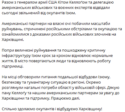 "На месте обсудили вопросы дальнейшего восстановления Изюма, ситуации безопасности и гуманитарной ситуации в регионе. Отдельно рассмотрели неотложные потребности области в военной сфере", - прокомментировал визит Синегубов.