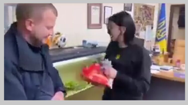 На нем девушка распаковывает врученный ей презент и радостно кричит: "Пропуск через площадь Рынок на мой Мерседес!" и целует своего парня - начальника патрульной полиции.