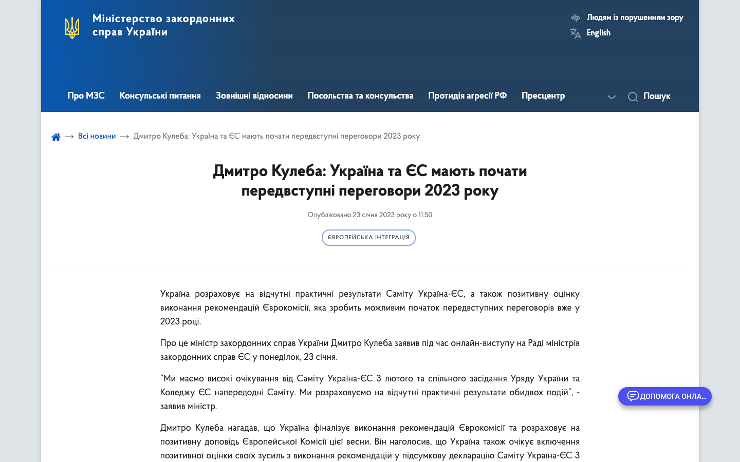 Ранее в ЕС заявляли, что промежуточная устная оценка выполнения Украиной реформ для открытия переговоров о вступлении состоится весной, но официальная - осенью 2023 года.