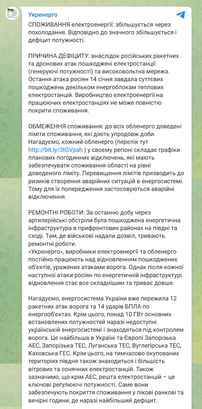 Сообщается, что во всех областях действуют лимиты потребления, превышение которых будет приводить к аварийным отключениям.