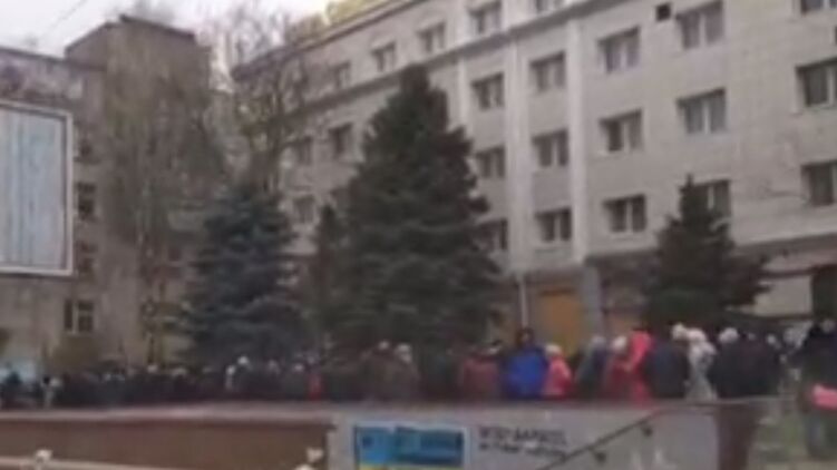 Жители Херсона стоят в очереди за выплатами. Скриншот из видео