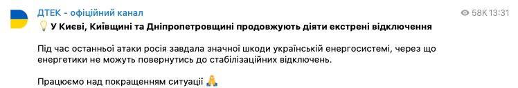Пока энергетики не могут вернуться к плановым графикам из-за значительного ущерба энергетике после сегодняшней ракетной атаки.