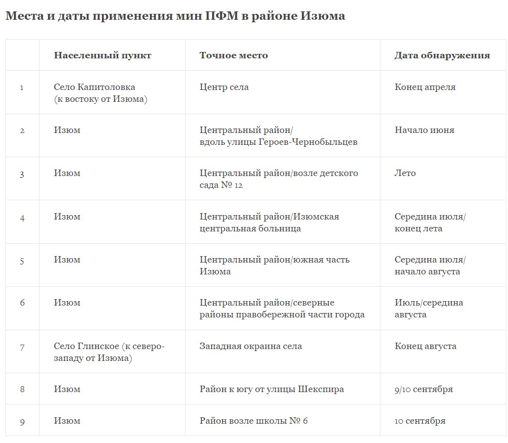Вместе с тем, правозащитники публикуют районы и даты, когда очевидцы, по данным HRW, видели в Изюме и его окрестностях противопехотные мины