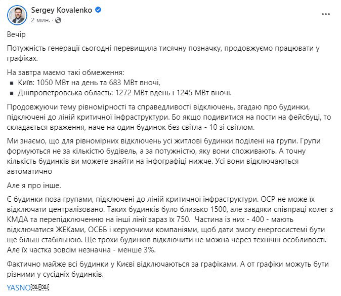 Об этом сообщил гендиректор Yasno Сергей Коваленко.