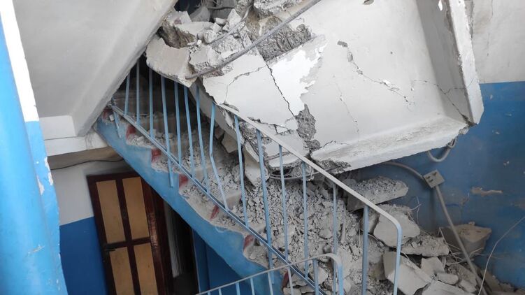 Полностью разрушены лестничные пролеты между 9 и 6 этажами, пробита стена, в большинстве квартир выбиты окна, сообщают в Донецкой ОГА.