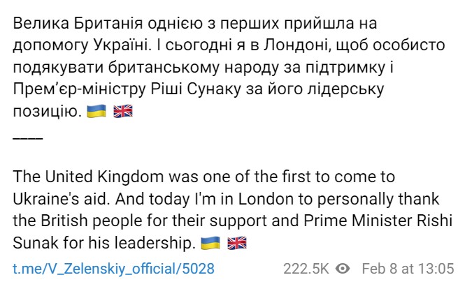 "И сегодня я в Лондоне, чтобы лично поблагодарить британский народ за поддержку и премьер-министра Риши Сунака за его лидерскую позицию", - добавил президент.
