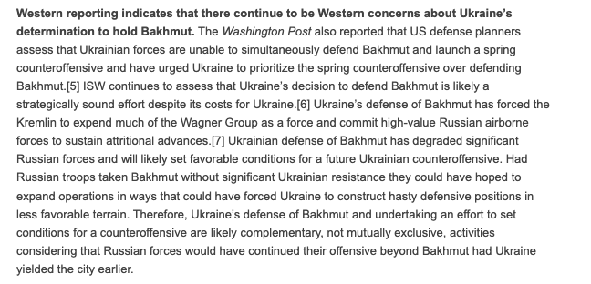 При этом американские военные планировщики по-прежнему считают, что Украина не может одновременно защищать Бахмут и начать контрнаступление, и призывают отдать приоритет контрнаступлению. При этом аналитики ISW отмечают, что оборона Бахмута вынудила РФ задействовать не только "вагнеровцев", а и ценные российские воздушно-десантные силы.
