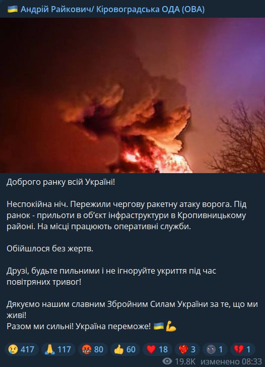 Там сообщается, что под утро были прилеты в объект инфраструктуры в Кропивницком районе, на месте работают оперативные службы.
