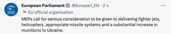 Также Европарламент призывает страны ЕС серьезно рассмотреть предоставление Украине истребителей, вертолетов, необходимых ракетных систем и существенно увеличить поставки боеприпасов.
