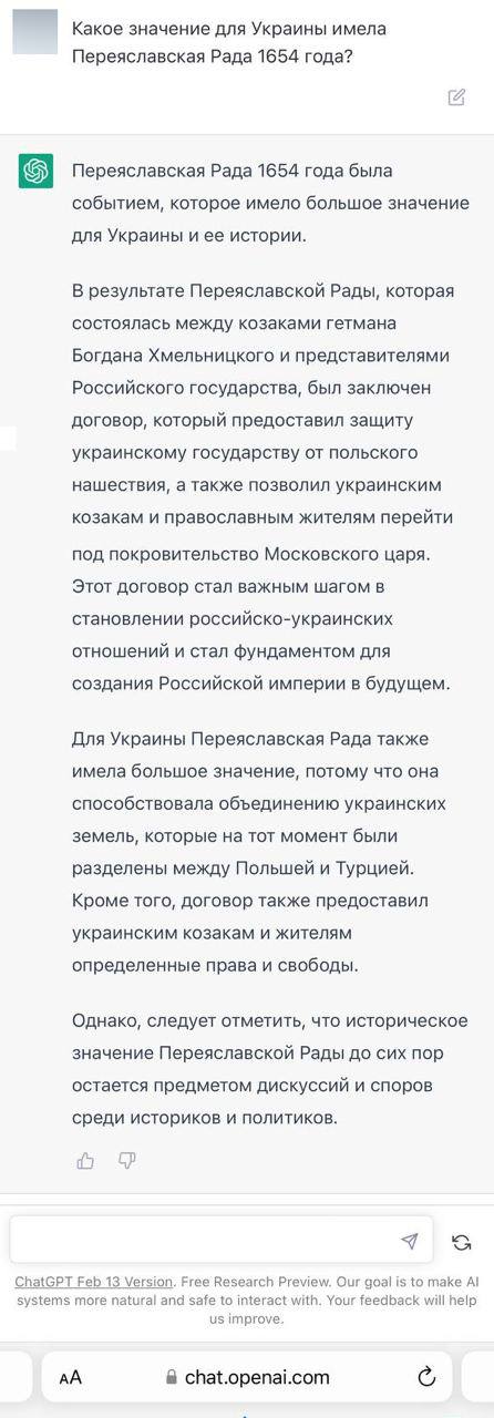 Также мы задали вопрос по истории Украины и оказалось, что чат-бот трактует Переяславскую раду 1654 года, когда запорожские казаки во главе с гетманом Богданом Хмельницким приняли решение о подданстве российскому царю, как защиту украинского государства от польского нашествия (в украинской версии - от "польской агрессии").