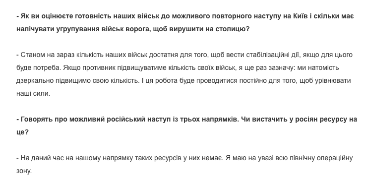 На вопрос журналиста, "как вы оцениваете готовность наших войск к возможному повторному наступлению на Киев", Наев ответил: