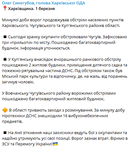 Также за минувшие сутки враг продолжал обстрелы населенных пунктов Харьковского, Чугуевского и Купянского районов области.