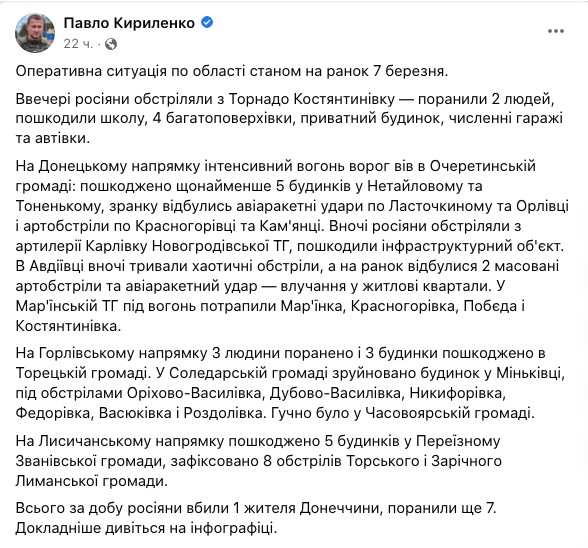 Вечером 7 марта россияне обстреляли из РСЗО "Торнадо" Константиновку. Ранения получили два человека.