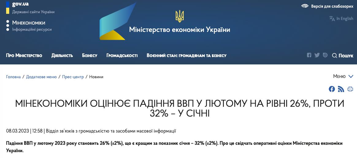 14:03 Падение украинского ВВП в феврале сократилось до 26% по сравнению с 32% в январе, сообщает Минэкономики.