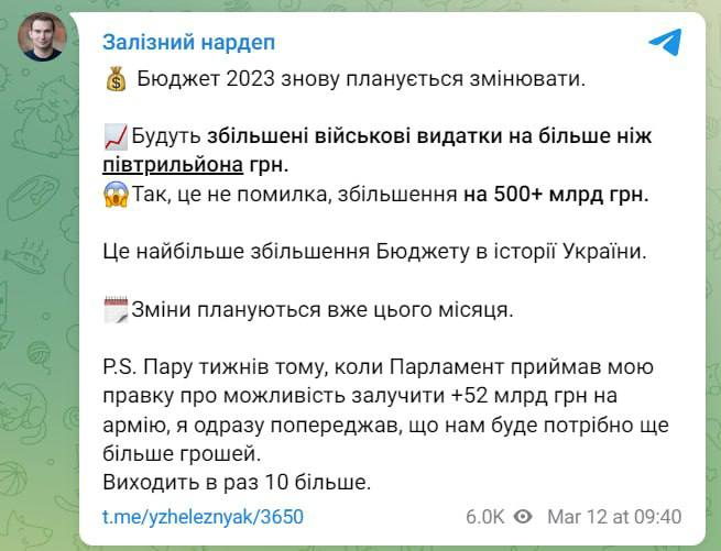 "Бюджет-2023 снова планируется менять. Будут увеличены военные расходы на более чем полтриллиона гривен", - пишет Железняк.