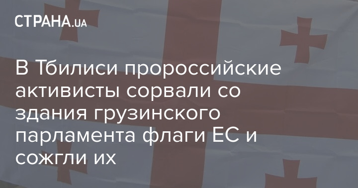 В Тбилиси правые активисты, которых оппоненты обвиняют в связях с Кремлем, сорвали со здания парламента Грузии флаги Евросоюза и сожгли их.