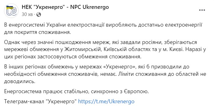 В Киеве, Киевской и Житомирской областях сохраняются сетевые ограничения, хотя электростанции Украины вырабатывают достаточно электричества для покрытия потребления.