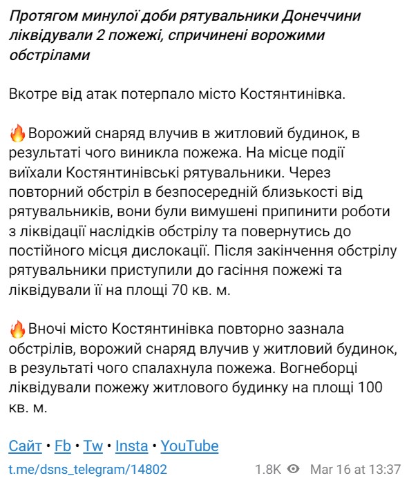 По данным спасателей, вражеский снаряд попал в жилой дом в городе. На место происшествия выехали Константиновские спасатели. Из-за повторного обстрела в непосредственной близости от спасателей они были вынуждены прекратить работы по ликвидации последствий обстрела и вернуться к постоянному месту дислокации. После окончания обстрела спасатели приступили к тушению пожара и ликвидировали его. Огонь распространился на 70 кв. м.
