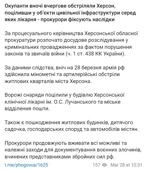 Войска РФ в ночь на 28 марта обстреляли Херсон. Попадание пришлось по клинической больнице им. Лучанского и местному отделению почты.