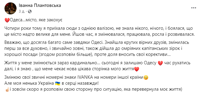 "Жизнь у меня меняется сейчас кардинально. Сегодня я оставляю Одессу пора двигаться дальше, и я знаю, что меня ждет новая интересная страница моей жизни. Меняю свои привычные номерные знаки IVANKA на номера другой страны. Но моя мать Украина в сердце навсегда! И совсем скоро я расскажу свою сторону о ситуации, которая перевернула мою жизнь", - пишет Плантовская.
