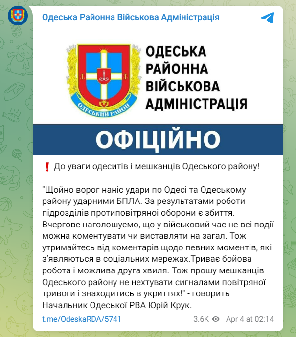 Отметим, воздушная тревога этой ночью была объявлена в Одесской области после часу ночи и длилась около двух часов.