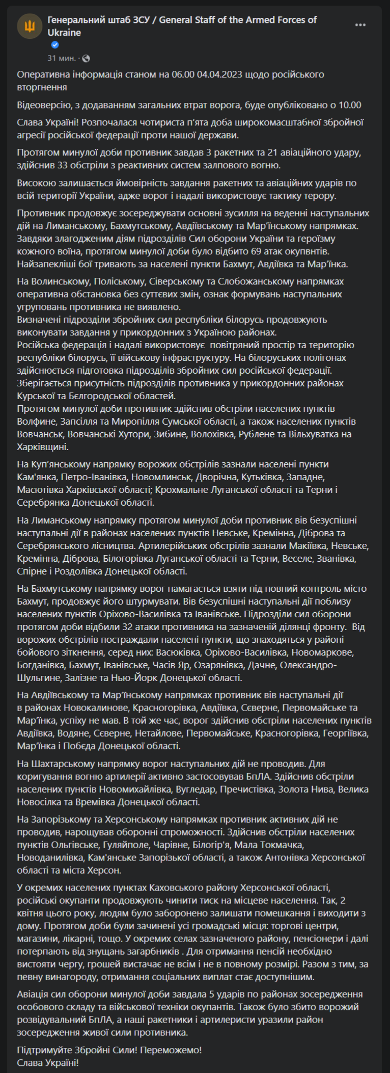 Утром во вторник, 4 апреля, Генштаб ВСУ опубликовал актуальную сводку о происходящем на фронте. Сообщается, что самые ожесточенные бои продолжаются за населенные пункты Бахмут, Авдеевка и Марьинка.