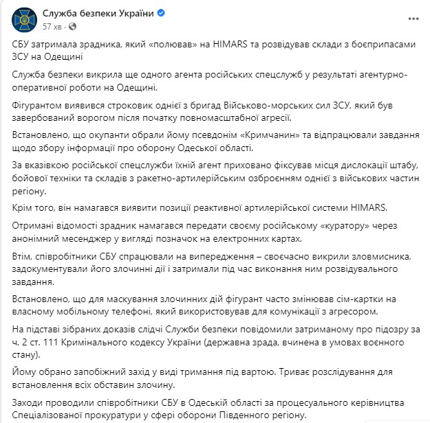 СБУ сообщает о задержании в Одессе срочника Военно-морских сил Украины, который, по версии следствия, передавал российским военным данные о дислокации штаба, боевой техники и складов боеприпасов, а также пытался зафиксировать расположение установок Himars.