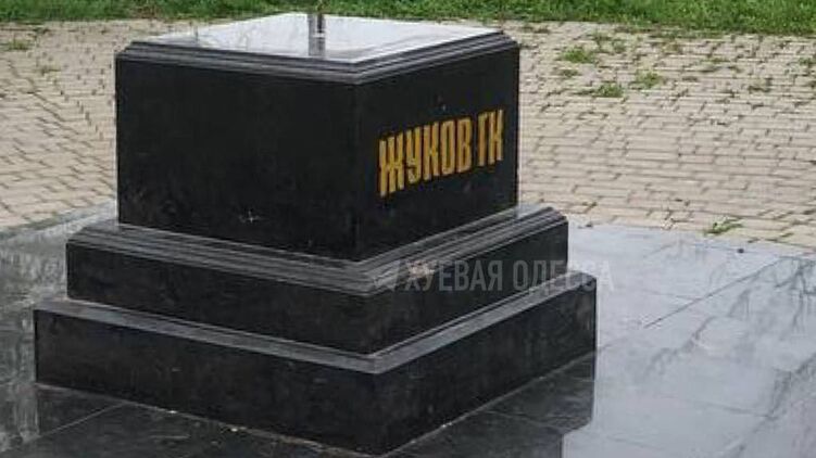 В Одессе местная жительница наклеила фамилию и инициалы советского полководца, маршала Советского Союза Георгия Жукова на место, где ранее был его памятник.