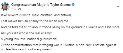Американского летчика уже поддержали трамписты. Конгрессмен США Марджори Тейлор Грин заявила, что "Джейк Тейшейра - белый мужчина, христианин и противник войны".