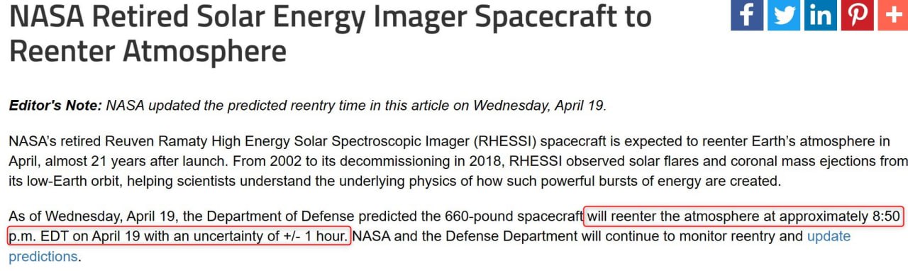 Что касается спутника RHESSI, о вероятном падении которого вчера заявляли украинские власти, то на сайте NASA опубликовали время, на которое был запланирован вход аппарата в атмосферу.