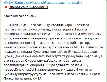 Ночью РФ атаковала Киев беспилотниками. Вероятно, это была новая партия иранских "Шахедов".