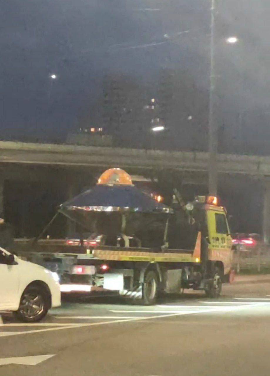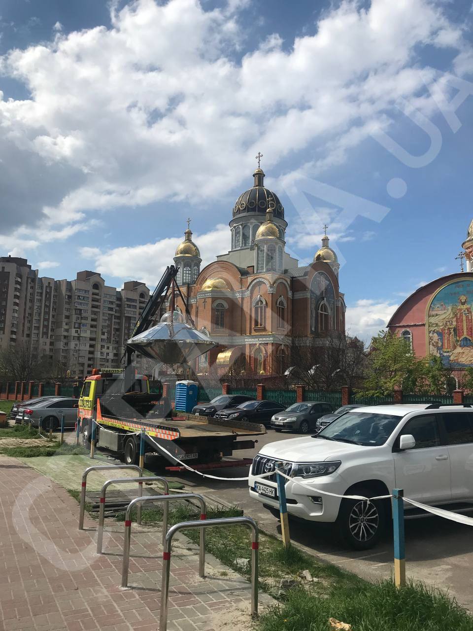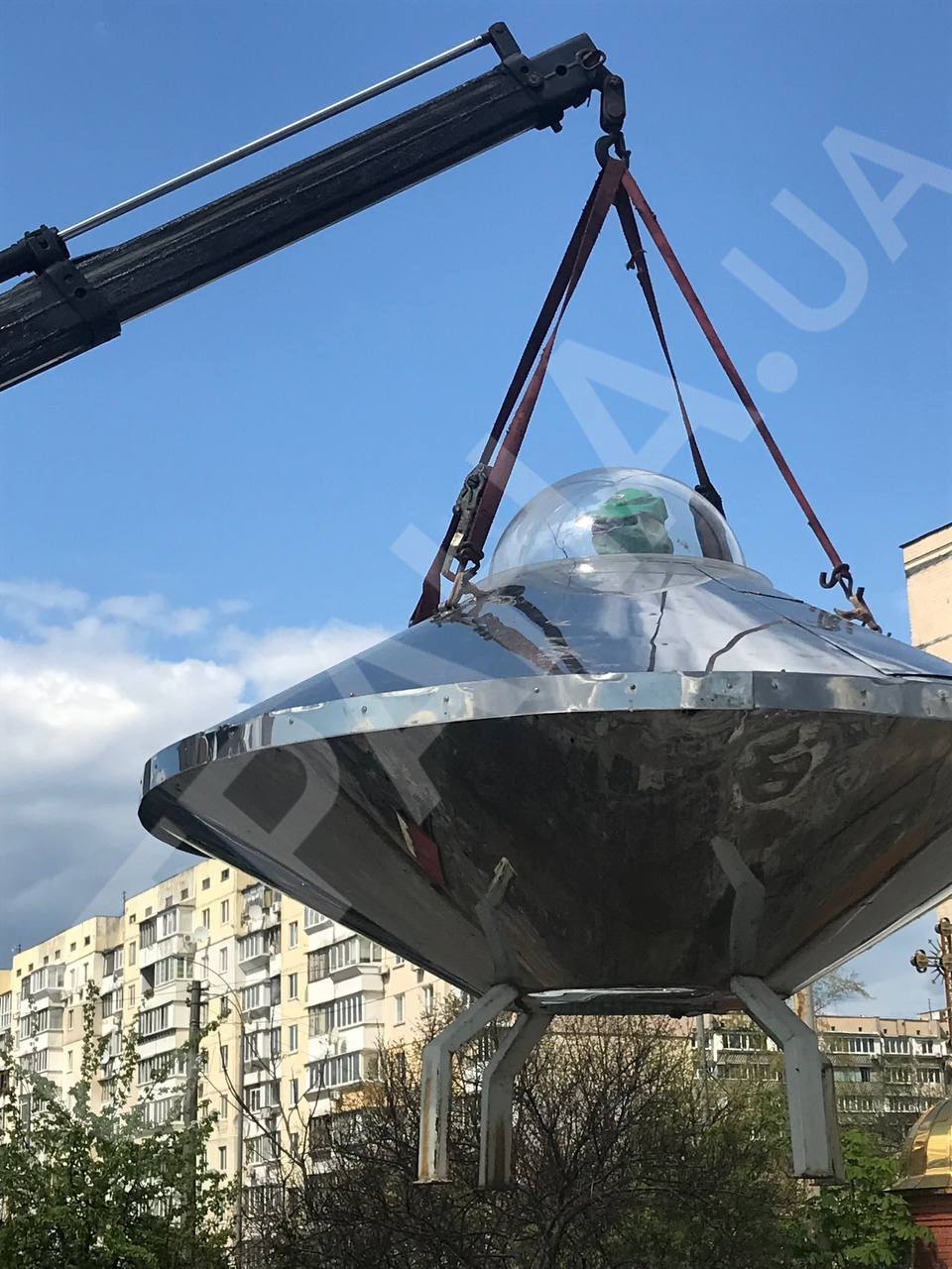 Летающая тарелка, которая стала звездой в киевских телеграм-каналах в ночь странной вспышки над столицей, сейчас находится на Оболонской набережной в Киеве рядом с парком "Наталка". Там она висит, прикрепленная к стреле эвакуатора.